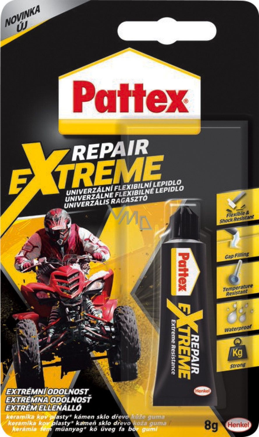 Pattex Repair Extreme je univerzální jednosložkové flexibilní lepidlo na bázi FLEXTEC polymeru neobsahující rozpouštědla. Určené k lepení a opravám savých i nesavých materiálů všech druhů, např.: dřevo, kov, sklo, keramika, Guma, kůže, zrcadla, kámen, plasty atd. Nedoporučuje se k lepení PP, PE, PTFE (Teflon) a skel, která jsou vystavena UV záření a trvalému působení vlhkosti.