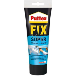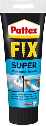 Pattex FIX Super je montážní lepidlo k lepení porézních materiálů pro použití v interiéru. Lepí lehké a savé materiály, např. dekorativní desky, polystyrenové prvky, dřevěné desky a zárubně apod.