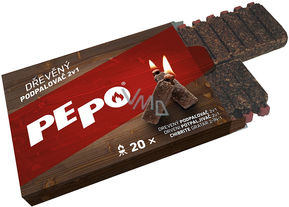 Podpałka drewniana Pe-Po, w kształcie łamanych kawałków, zawiera sprasowane wióry drewniane nasączone parafiną i na końcu jest wyposażona w zapałkę. Zapałka jest częścią opakowania. Interesująca alternatywa dla tradycyjnych stałych lub płynnych podpałek.