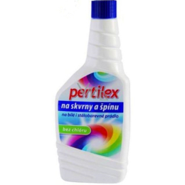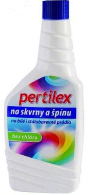 Pertilex bezpečně zbavuje textilie těžko odstranitelných skvrn a špíny. Aplikuje se snadno, rychle a přesně. Je vhodný pro bílé i stálobarevné prádlo. Naobsahuje chlór, a proto nepoškozuje barvy ani tkaniny.