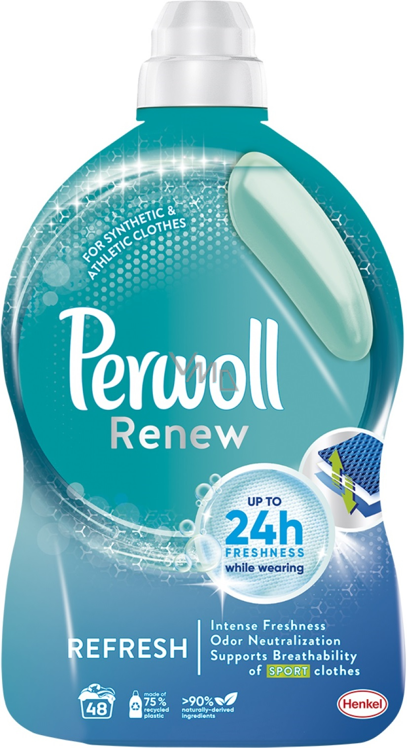 Speciální prací gel Perwoll Renew Refresh Sport pro neutralizaci zápachu a intenzivní svěžest. Prací prostředek Perwoll Renew nabízí intenzivní svěžest a je speciálně vyvinut pro uchování tvaru oblečení ze syntetických vláken. Obsahuje složku Deo-tech, která neutralizuje zápach a zaručuje až 24hodinovou svěžest.