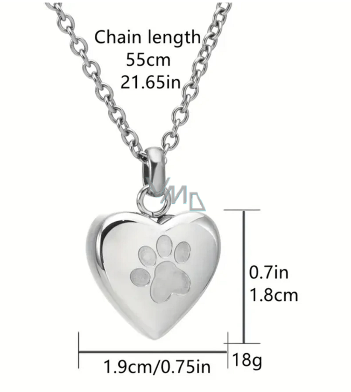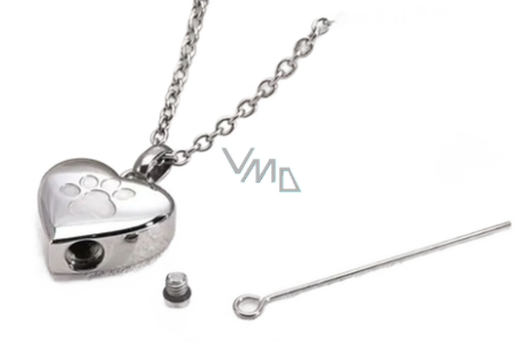 Elegantní pietní náhrdelník ve tvaru srdce s vyrytým motivem zvířecí tlapky je určen jako vzpomínkový šperk pro uchování symbolické části popela, zeminy z oblíbeného místa či drobné památky na vašeho mazlíčka. Vyroben je z kvalitní nerezové oceli, která je odolná vůči korozi a vodě, takže si jej můžete bez obav ponechat při každodenním nošení.