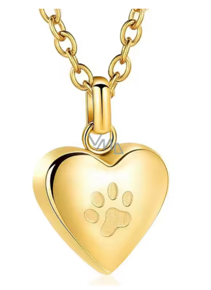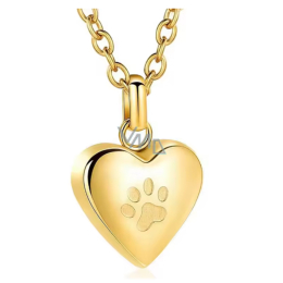 Pamětní, pietní urnový přívěsek, Srdce lesklé zlaté tlapka, voděodolné, nerezová ocel 19 x 18 mm + řetízek 55 cm
