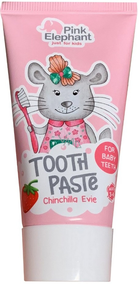 Dziecięca pasta do zębów o smaku truskawkowym Pink Elephant Činčila Nela delikatnie czyści mleczne zęby dzieci bez uszkadzania cienkiej szkliwa. Zawiera płynny wapń, który zapobiega powstawaniu próchnicy i aloesowy sok.