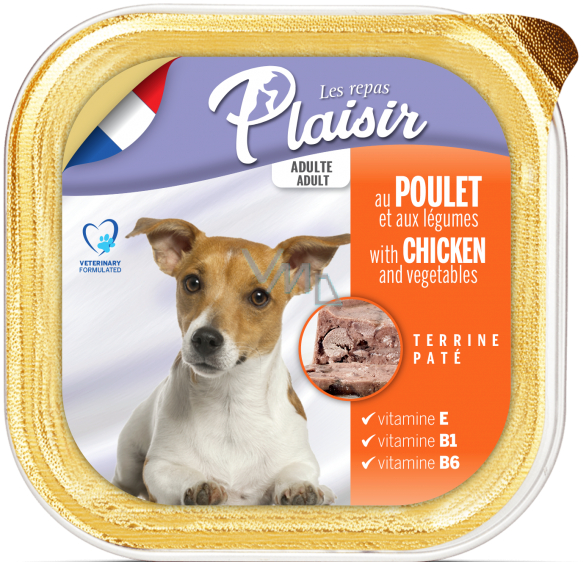 Vanička Plaisir PATÉ s kuřecím a zeleninou je kompletním krmivem pro dospělé psy.