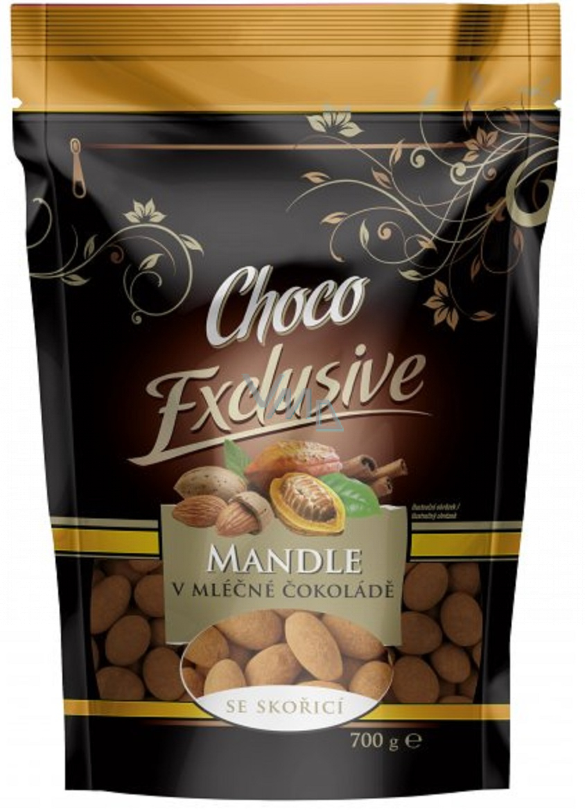 Mandle v mléčné čokoládě se Skořicí - Čokoládová pochoutka pro dospělé i malé děti, vyrobeno z kvalitní Čokolády a těch největších Mandlí. V mléčné čokoládě obsah kakaové sušiny nejméně 25 %. Vedle Kakaového másla obsahuje Čokoláda rostlinné Tuky. Výrobek může obsahovat stopy arašídů, jiných skořápkových plodů, obilovin obsahujících lepek, sóji a Sezamu.