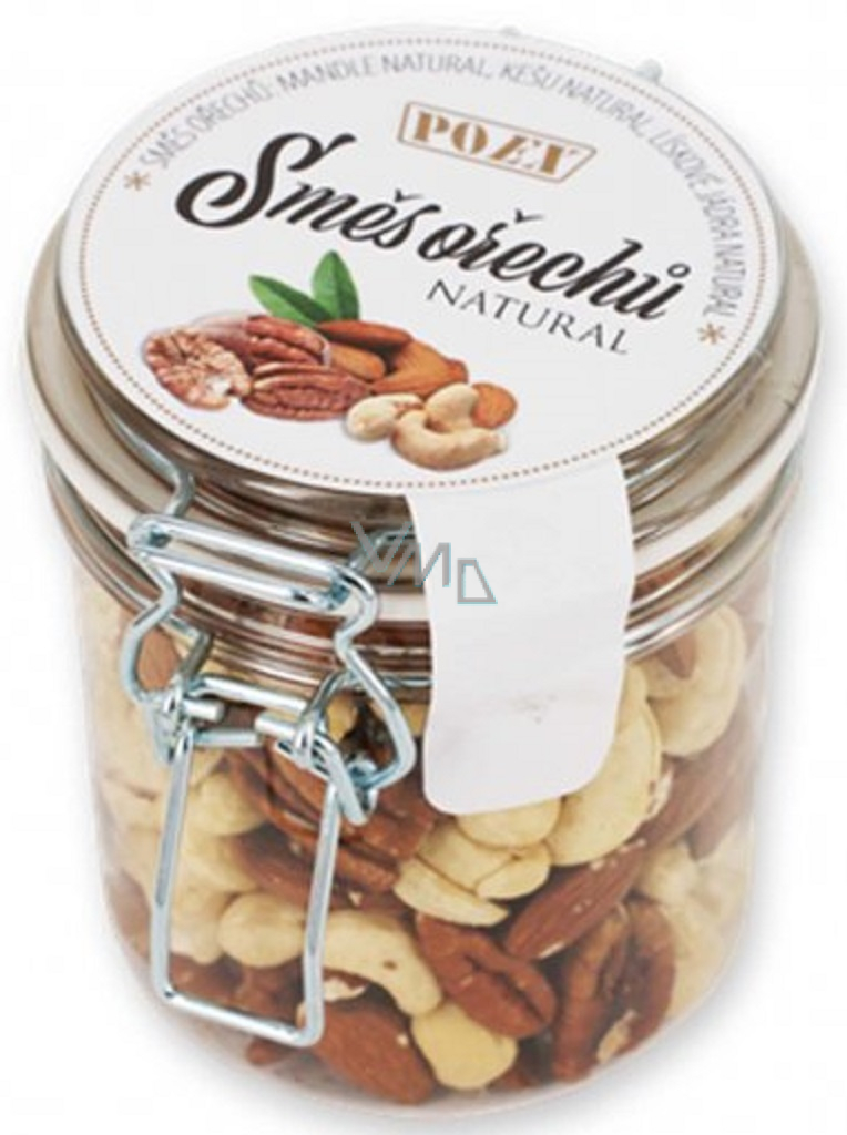 Směs skořápkových plodů. Směs obsahuje skořápkové plody v různém poměru (jádra Kešu ořechů, jádra Mandlí, jádra pekanových ořechů). Výrobek může obsahovat stopy arašídů, jiných skořápkových plodů, Mléka, obilovin obsahujících lepek, sóji a Sezamu. Může obsahovat úlomky skořápek.