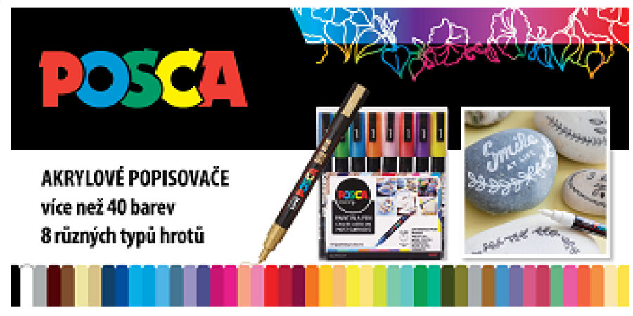 POSCA akrylové popisovačeZa posledních 30 let doprovázela značka Posca kreativní tvorbu po celém světě. Značka barevných popisovačů POSCA, která vznikla na počátku 80. let, byla okamžitým úspěchem mezi uměleckými komunitami vznikajícími v městských kulturách, zejména v komunitě graffiti. Graffiti umělci velmi rychle přijali značku, která splnila všechny jejich potřeby: pohodlný a efektivní, jednoduše ideální způsob, jak mít vždy potřeby pro malování v kapse. Umělci z ateliérů začali chodit ven a zkoušet si Street Art, zatímco graffiti umělci začali malovat na plátnech. Tyto vzájemné výměny jsou zdrojem důvěry v popisovače POSCA, která od té doby neustále získává nové nadšence. Ke stažení Přehled barev, hrotů a aplikací na většinu povrchů: | ![]() | |||||