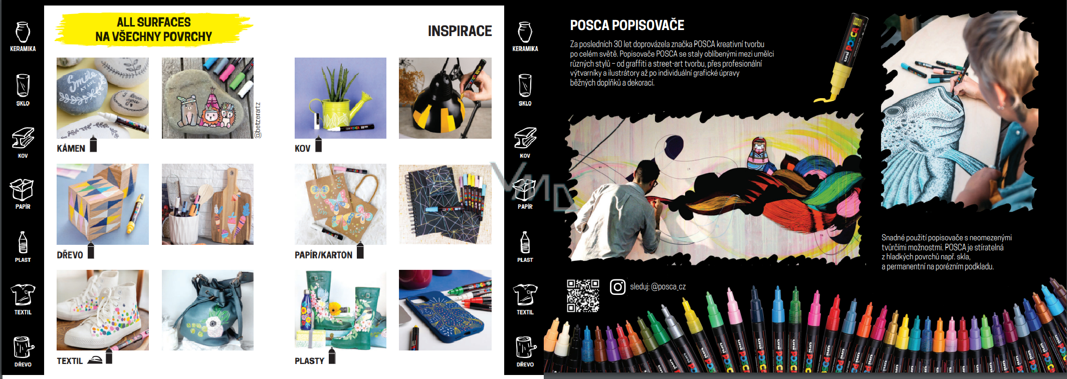 Pisak na bazie wodnej o unikalnych właściwościach. Posiada doskonałą zdolność krycia. Jest trwały i nie pachnie. Można go stosować praktycznie na każdej powierzchni, na przykład na tekstyliach, papierze, metalu, ceramice, drewnie, porcelanie, kamieniu lub szkle. Posca z cienkim grotem jest odpowiednia dla artystów i projektantów, ale także dla początkujących. Przed użyciem należy dobrze wymieszać kolor za pomocą kulki wewnątrz tuby.