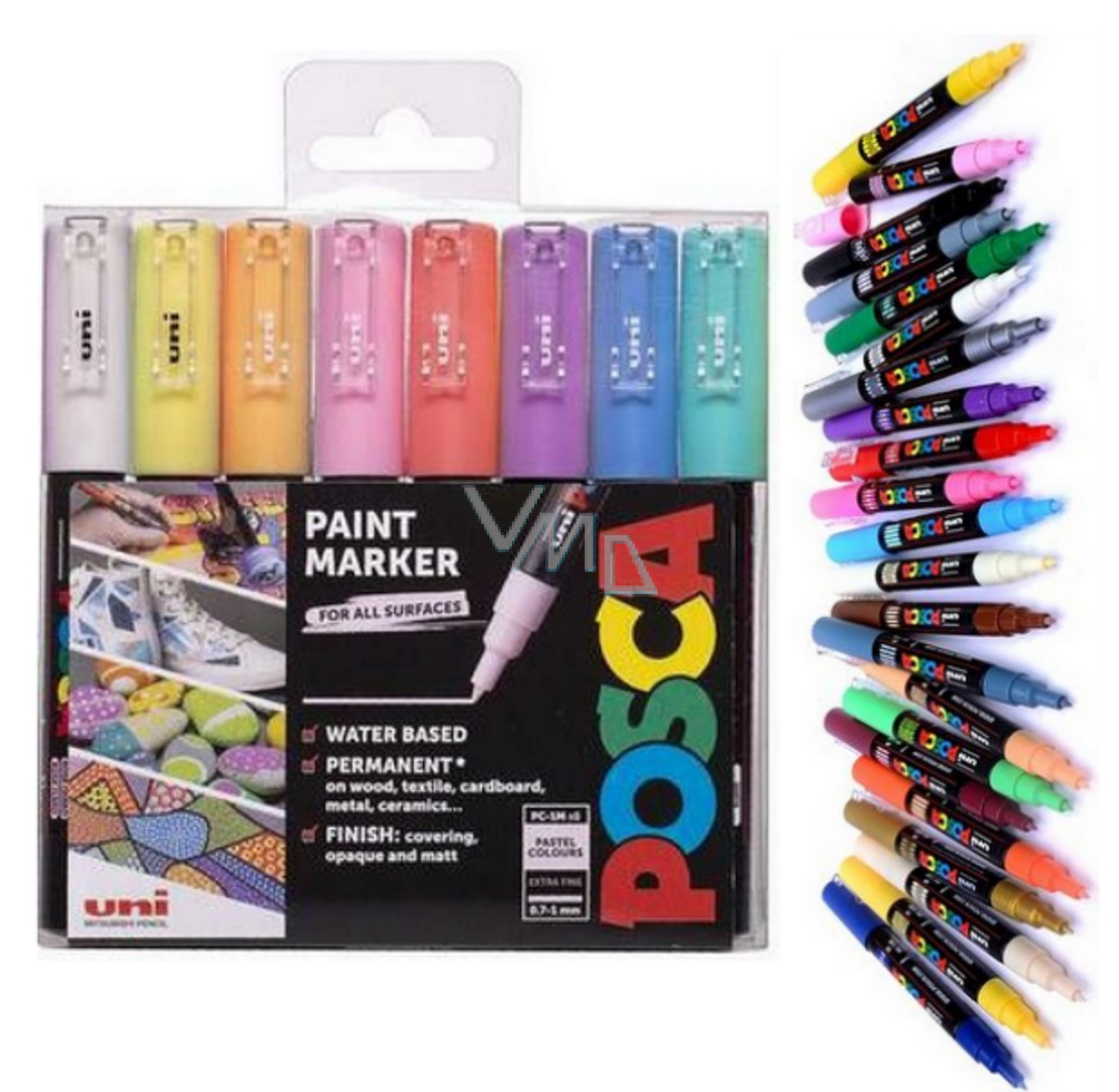 Marker na bazie wody o unikalnych właściwościach. Ma doskonałą zdolność krycia. Jest permanentny i bezwonny. Można go używać praktycznie na każdej powierzchni, na przykład na tkaninie, papierze, metalu, ceramice, drewnie, porcelanie, kamieniu lub szkle. Posca pen z cienką końcówką jest odpowiednia dla artystów i projektantów, ale także dla początkujących. Przed użyciem należy dobrze wstrząsnąć farbą za pomocą kulek wewnątrz tuby.