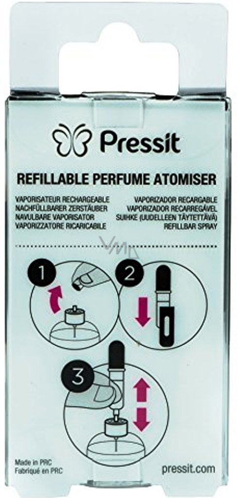 Pressit to genialny dodatek do Twojego klasycznego perfumu. Pressit nie wymaga żadnej lejka i jest szczelny. Napełnia się bezpośrednio z oryginalnego flakonu, nakładasz go bezpośrednio na dyszę ssącą (po zdjęciu górnej nakładki sprayowej), ścisnąć i pompować. W ciągu kilku sekund Pressit jest gotowy do użycia.