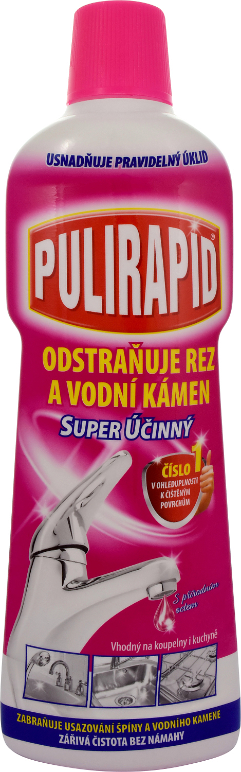 Pulirapid Aceto czyści do wysokiego połysku i usuwa osady wapienne, ślady mydła i rdzy w kuchni, łazience i na dużych powierzchniach.