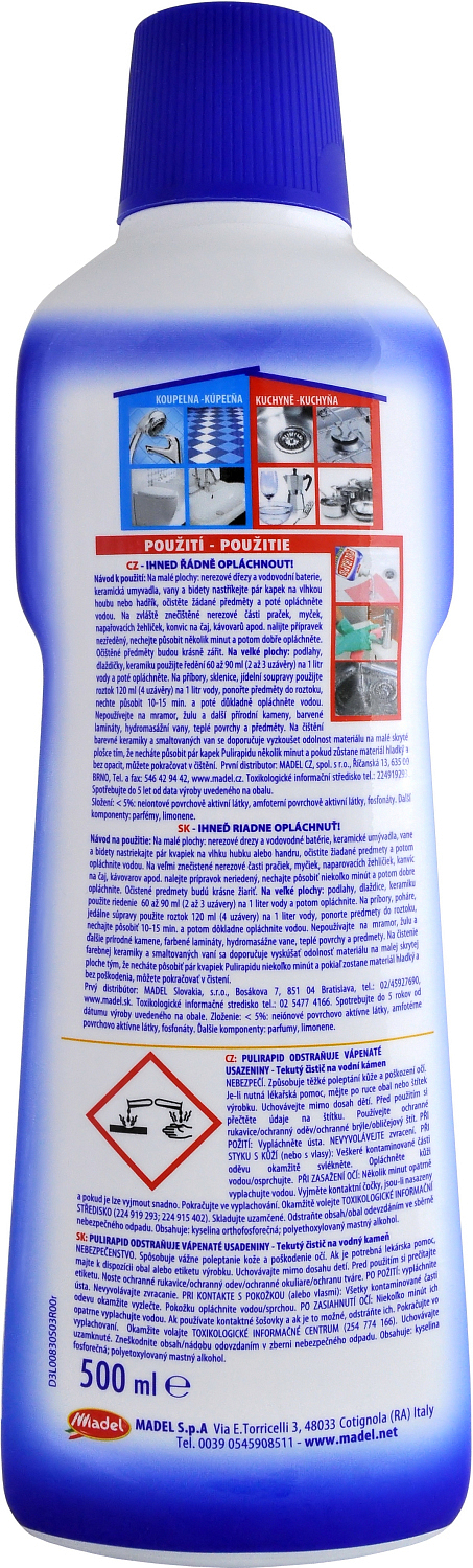 Niezrównana jakość w walce z kamieniem wodnym, rdzą i resztkami mydła. Pulirapid zawiera mieszankę skutecznych kwasów, które usuną wszelkie zanieczyszczenia.