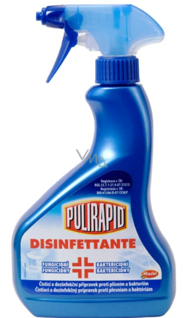 Pulirapid Disinfettante baktericidní a fungicidní prostředek, který čistí a desinfikuje všechny omyvatelné povrchy koupelny, kuchyně, dveře, vnitřky ledniček, pracovní kuchyňské plochy, kuchyňské kráječe, nože atd.