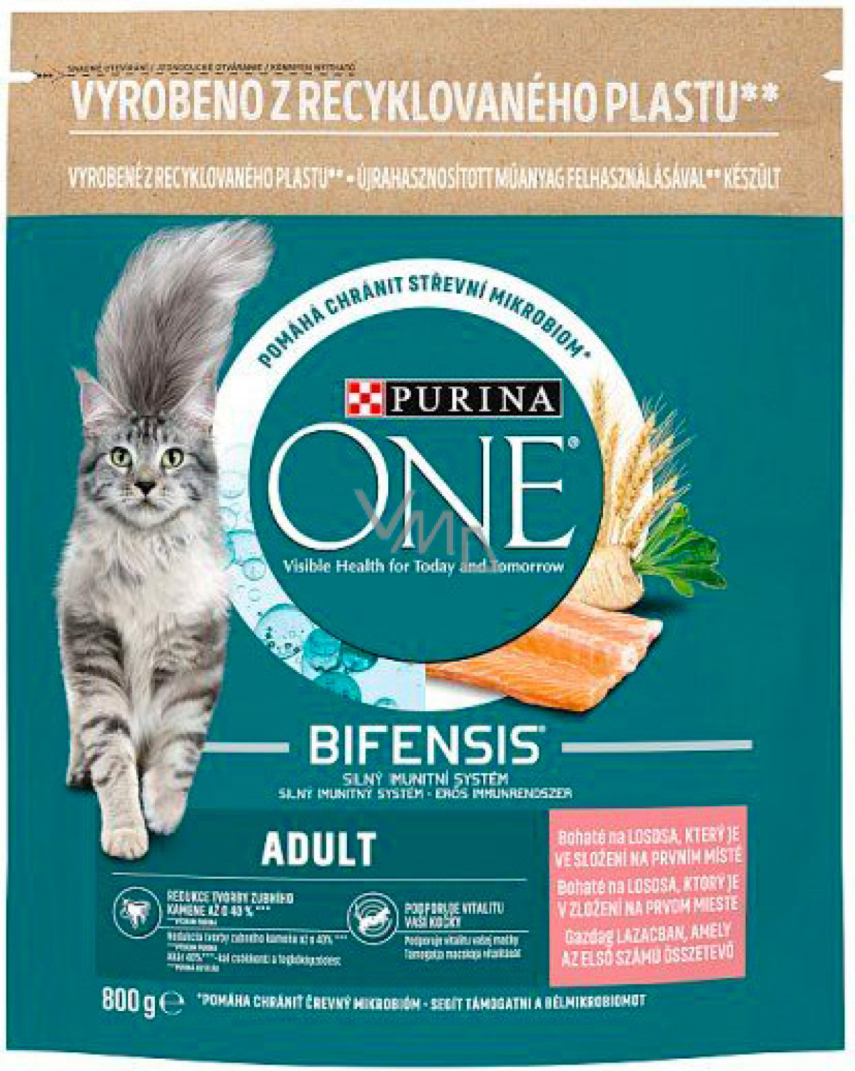 Purina One Adult Komplettna karma z łososiem i ziarnami została opracowana w odpowiedzi na potrzeby dorosłych kotów powyżej jednego roku życia. Unikalna formuła żywieniowa Purina One Bifensis®, stworzona przez ekspertów żywieniowych i weterynaryjnych, zawiera korzystne bakterie, kluczowe składniki odżywcze oraz kwasy tłuszczowe omega-6, których potrzebuje twój kot. Dzięki składnikom wysokiej jakości ta karma zapewnia łatwe wchłanianie składników odżywczych i wzmacnia naturalną odporność twojego kota zarówno od wewnątrz, jak i na zewnątrz. Podwójna formuła ochronna wspiera tworzenie naturalnych przeciwciał w organizmie kota i jednocześnie przyczynia się do utrzymania zdrowej skóry i sierści. Nie zawiera sztucznych barwników, aromatów ani konserwantów.