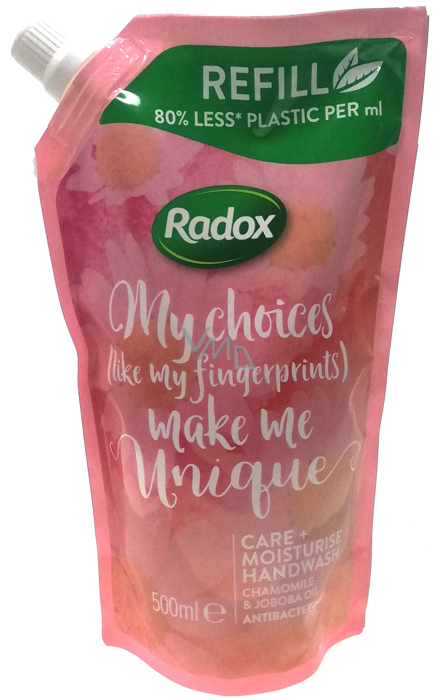 Tekuté mýdlo Radox vám při běžném mytí rukou dopřeje pocit čistoty a ochrany. Při každém použití nabízí antibakteriální účinky, obohacené o zklidňující heřmánek a hydratující jojobový olej, které doplní jemná vůně. Praktické balení s pumpičkou je hygienické a nadávkuje přesně tolik přípravku, kolik je třeba. Po nanesení na vlhkou pokožku vytvoří příjemnou bohatou pěnu, která vaše ruce zbaví špíny a bakterií a zároveň o ně pečuje a chrání před vysoušením. Po aplikaci vás bude vůně ještě chvíli provázet a zanechá svěží dojem