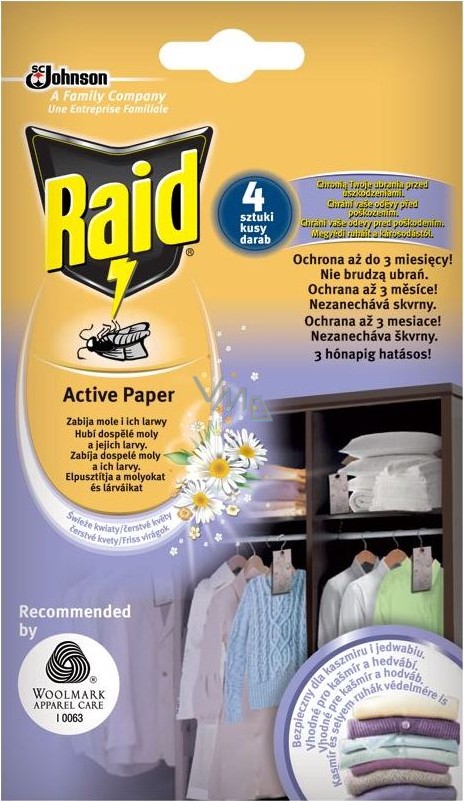 Raid proti molům aktivní závěs čerstvé květy, insekticid chrání Vaše oděvy v zásuvkách i šatnících proti molům šatním. Impregnovaný papír s účinnou látkou poskytuje ochranu až 3 měsíce. Závěs uvolňuje příjemnou čerstvou květinovou vůni. Nezanechává skvrny na kašmíru, hedvábí ani vlně.