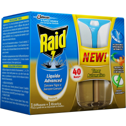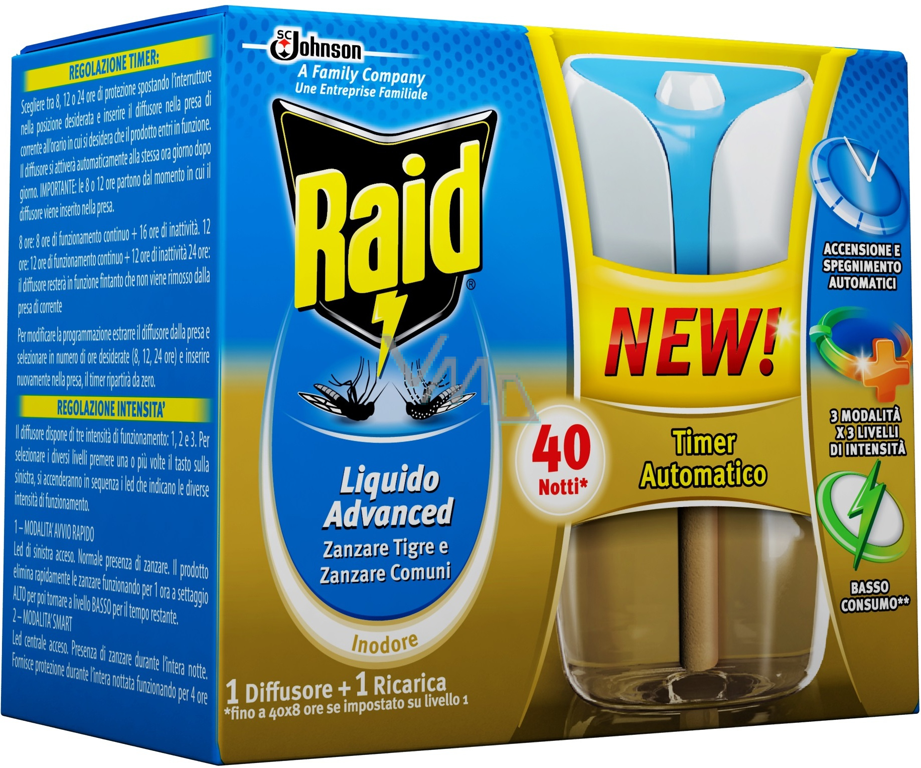 Raid elektrický odpařovač Advanced s tekutou náplní, insekticid proti komárům, šetří energii. Automaticky se vypne/zapne, má programovatelný časovač, který si pamatuje nastavení. Zvolte ochranu 8,12 či 24 hodin a zapojte ho. Stane se tak automaticky každý den ve stejný čas.