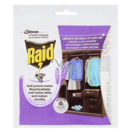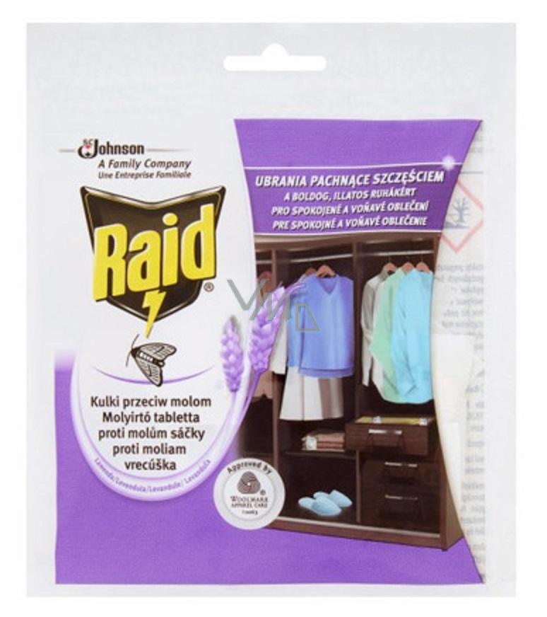 Raid proti molům sáčky levandule, insekticid chrání oblečení a látky proti molům šatním a jejich vajíčkům až 3 měsíce. Je uložen v sáčcích s mikrootvory, které mohou být umístěny přímo k oblečení či do jeho kapes, aniž by na něm zanechaly skvrny. Hubí moly a jejich vajíčka do 2 hodin, příjemně voní.