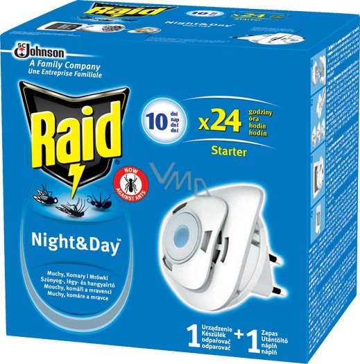 Raid - elektrický odpařovač je velice účinný insekticidní přípravek proti komárům a mouchám. Nová technologie kombinuje kompaktní odpařovač s koncentrovanou náplní bez parfemace. Toto balení vás po dobu 10 dní zbaví obtížného hmyzu. Nainstalujte si 24 hodinovou ochranu a můžete v klidu spát. Obsahuje kontrolku, která vás upozorní na výměnu náhradní náplně.