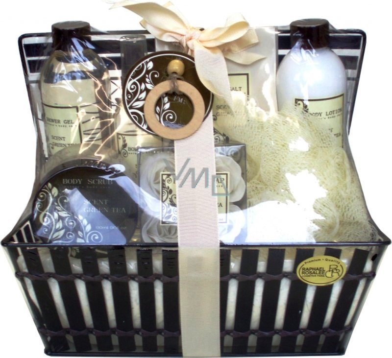 Raphael Rosalee Cosmetics Zelený čaj sprchový gel 260 ml + tělové mléko 260 ml + tělový sprej 100 ml + tělový peeling 100 ml + sůl do koupele 150 g + toaletní mýdlo 4x4 g + masážní žínka, kosmetická sada