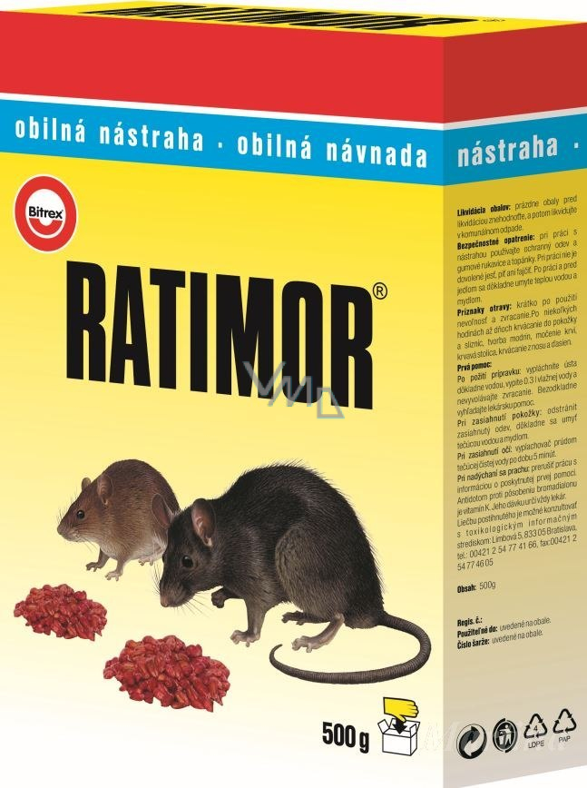 Ratimor obilnou nástrahu používáme jako rodenticid ve skladištích se zemědělským provozem, v domácnosti, ve sklepě, v okolí děr, podél zdí rod. domů, chat a sice pro:
