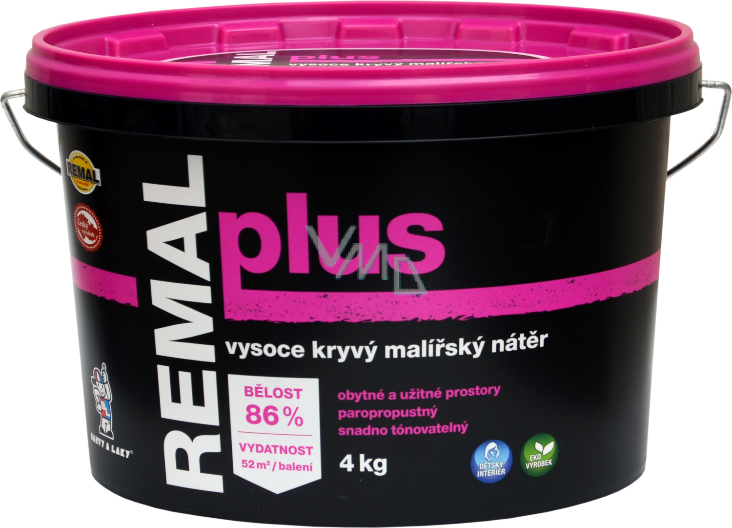 Farba REMAL Plus to klasyczna, naturalna farba malarska na bazie kaolinu, rozcieńczalna wodą. Doskonale kryje, jest przepuszczająca, odporna na ścieranie i ma standardową biel 86%. Farba na ścianę REMAL jest używana do malowania ścian i sufitów we wnętrzach na tynki, beton, jako farba do płyt gipsowo-kartonowych, płyt cetris, wiórowych oraz tynków renowacyjnych. Farba wykazuje odporność na ścieranie na mokro według normy ČSN EN ISO 11998 – klasa 5. (klasyfikacja według EN 13300).