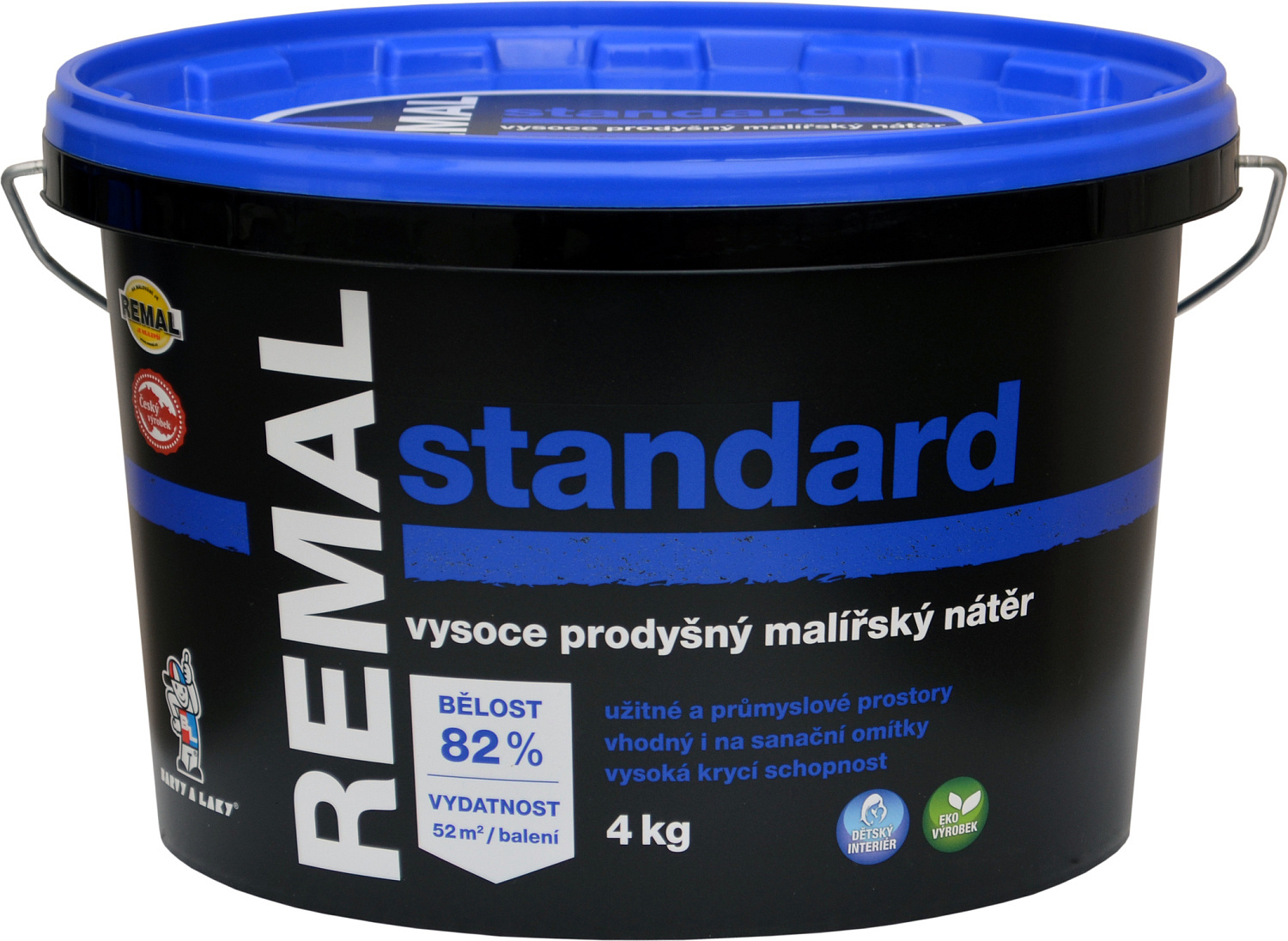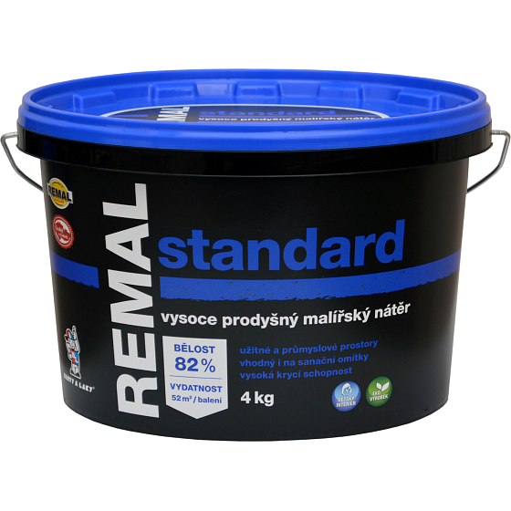 REMAL Standard to klasyczna naturalna farba malarska na ściany, rozcieńczalna wodą. Świetnie kryje, jest przepuszczalna, odporna na ścieranie i ma standardową biel 82%. Farba na ściany REMAL jest używana do malowania tynków, betonu, płyt gipsowo-kartonowych, płyt Cetris, wiórowych oraz tynków renowacyjnych w wnętrzach. Farba wykazuje odporność na ścieranie na mokro – mierzona zgodnie z ČSN EN ISO 11998 – klasa 5. (klasyfikacja zgodnie z EN 13300).