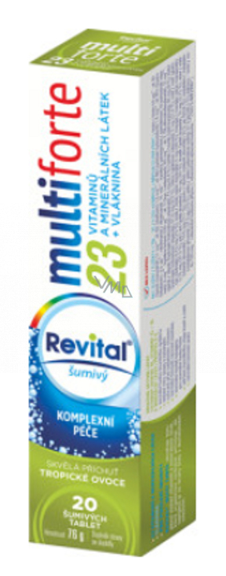 Revital Multi forte Tropické ovoce - Obsahuje 23 vitamínů a minerálních látek + vlákninu. Se skvělou příchutí tropického ovoce. Vitaminové tablety s minerálními látkami. Se sladidlem. Bez přidaného cukru. Vhodné i pro diabetiky. Bez lepku.