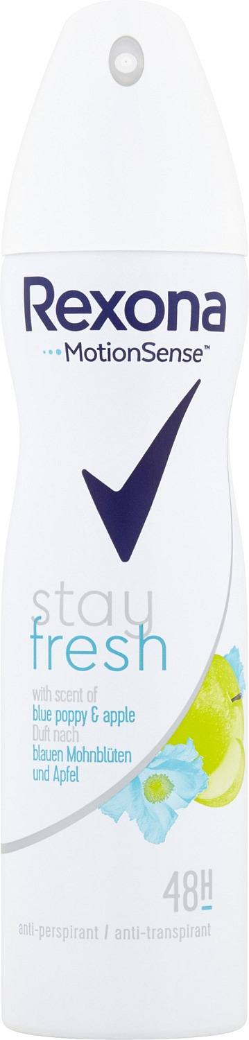 Rexona Stay Fresh Błękitny Mak & Jabłko anтиперспирант w sprayu zawiera innowacyjną technologię MotionSense, która stopniowo uwalnia świeży zapach, gdy tego najbardziej potrzebujesz. Działa tak, że mikrokapsułki, które zamykają zapach, osiadają na skórze po aplikacji. Kiedy się ruszasz, pocieranie powoduje, że kapsułki pękają, uwalniając zapach. Tak więc im bardziej się ruszasz, tym bardziej działa.
