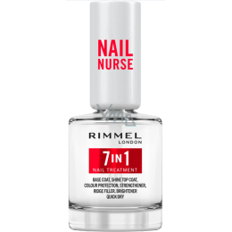 Rimmel London odnawiający lakier Nail Nurse 7w1 służy jako podkładowa warstwa, błyszczący top coat, ochrona koloru, wzmocnienie paznokci, wypełnienie paznokci i rozjaśnienie. Szybkoschnąca formuła zawiera olej z awokado, sól morską, ekstrakt z jabłka granatu i wapno. Pomaga odzyskać wytrzymałość, nawilżenie i naturalny blask paznokci.