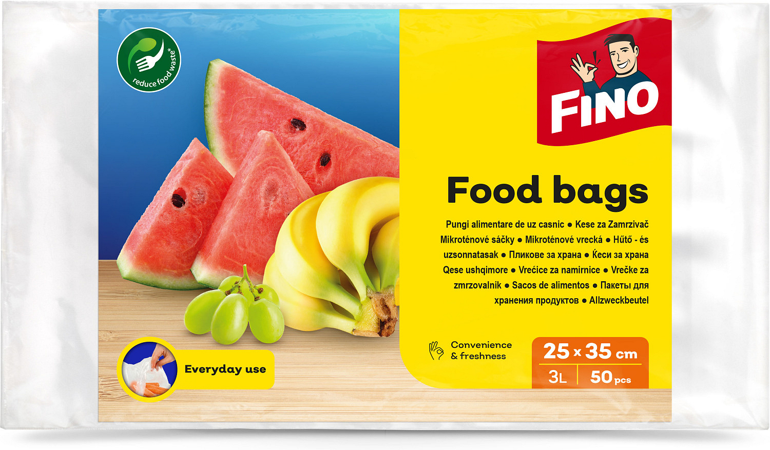 Torby na przekąski FINO, rozmiar 25 × 35 cm, 50 sztuk w opakowaniu. Bardzo praktyczne i łatwe w użyciu. Zajmują minimalną ilość miejsca w szufladzie.