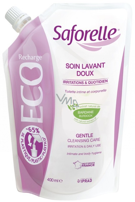 Saforelle jemný mycí gel Eco pack pro hygienu citlivé a podrážděné pokožky intimních partií i celého těla. Saforelle® obsahuje přírodní extrakt z lopuchu většího (Arctium lappa), zmírňuje podráždění a dyskomfort v intimní oblasti. Díky jemnému složení bez obsahu mýdla je ideální pro každodenní hygienu.