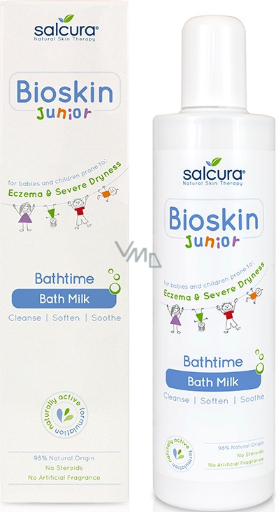 Salcura vyvinula řadu Bioskin Junior, která nabízí snadné, přírodní a účinné řešení pro pleť miminek a dětí nad 3 měsíce. 98% přírodní výživné mléko do koupele, které čistí a zklidňuje suchou pokožku i pokožku se sklonem k ekzémům dětí i kojenců. Kombinuje přírodní, aktivní a pro děti prospěšné látky. Zklidňuje, zjemňuje a čistí pokožku. Vhodné pro péči o pleť se sklony k suchosti a ekzémům. Snadno se používá, je nemastné a poskytuje Vašemu dítěti příjemný prožitek z koupele.