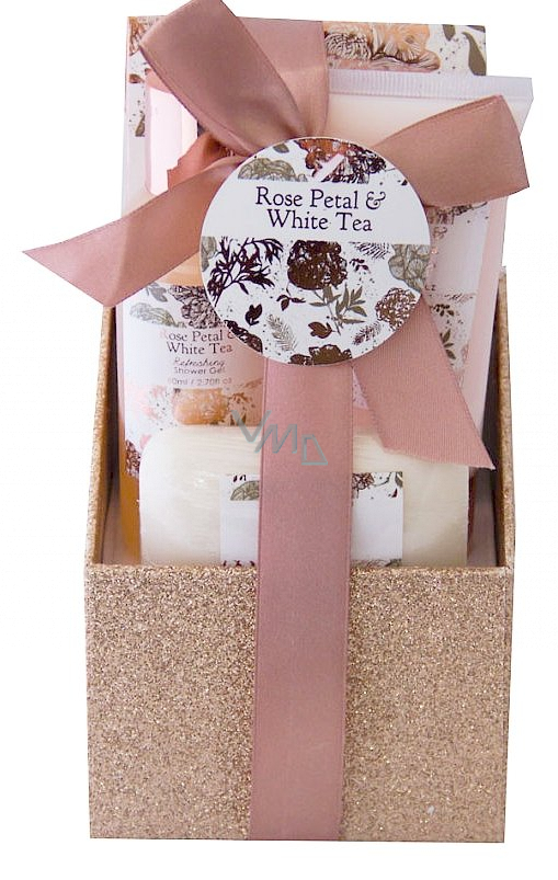 Nádherný kosmetický set v košíku potěší každého, kdo miluje kvalitní péči o pleť prostřednictvím výživných přírodních látek s podmanivou vůní bílého čaje a růžové vody.