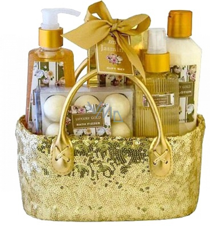 Salsa Collection Luxury Gold sprchový gel 200 ml + tělové mléko 270 ml + tělový sprej 120 ml + šumivá koule do koupele 6 x 15 g + sůl do koupele 200 g + zlatá taška, kosmetická sada