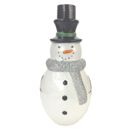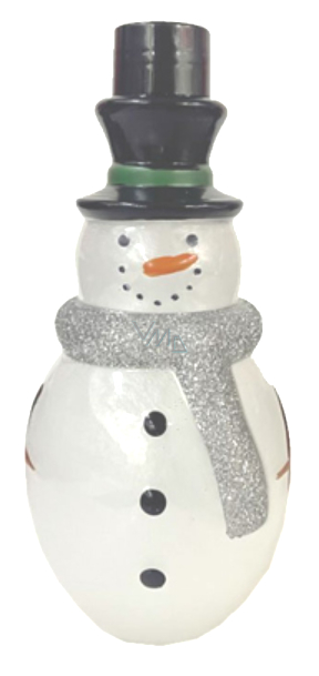 Zdobená láhev ve tvaru sněhuláka naplněná sprchovým a koupelovým gelem. V bílé barvě a vůní bílého čaje.