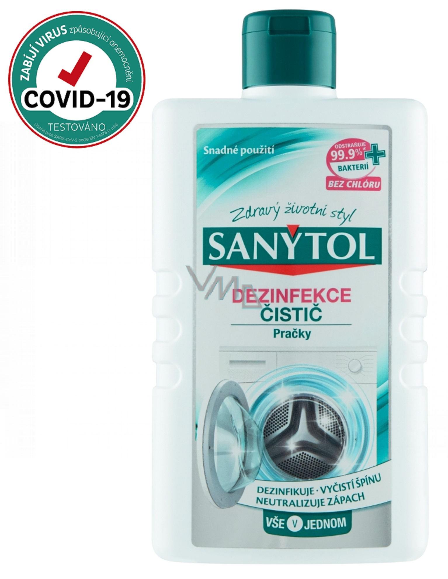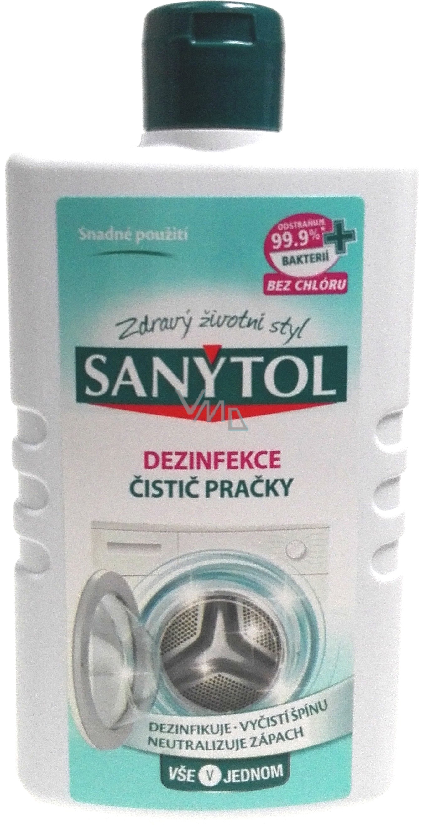 Každý prací cyklus zanechává v pračce zbytky prášku, nečistoty a vodní kámen, které mohou poškodit pračku. Sanytol, expert na dezinfekci bez chlóru, vyvinul dezinfekční čistič pro pračky, který eliminuje 99,9% bakterií. Čistí, dezinfikuje a zabraňuje dalšímu znečištění. Pomáhá dlouhodobě zlepšovat výkon pračky. Složení vše v jednom čistí a dezinfikuje pračku, eliminuje bakterie a zápach, odstraňuje nečistoty a vodní kámen. Pouze naprosto čistá a dezinfikovaná pračka garantuje čisté a svěží prádlo.