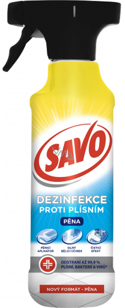 Savo przeciw pleśniom pianka na spoiny. Płynny środek czyszczący i dezynfekujący, który skutecznie usuwa nie tylko pleśnie, bakterie i obleczone wirusy. Powierzchnię dezynfekuje i pięknie wybiela. Nowa formuła aplikowana w formie aktywnej pianki nie tworzy agresywnego aerozolu i nie dochodzi do niezamierzonego splamienia sąsiednich powierzchni. Dzięki specjalnemu aplikatorowi tworzącemu pianę, środek dłużej przylega do ścian, w spoinach oraz w innych trudno dostępnych miejscach. Pianka umożliwia dłuższe przyleganie środka do podłoża i jest tak skuteczniejsza.