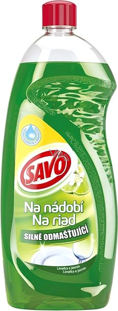 Přípravek na mytí nádobí s vůní limetky a jasmínu. Účinkuje i ve studené vodě, rychlé a účinné odmaštění. Savo Na nádobí se díky obsahu citronové šťávy vyznačuje nekompromisní odmašťovací silou (odstraní mastnotu i z plastového nádobí).