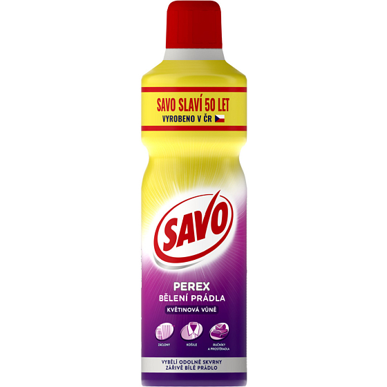SAVO Perex Kwiatowy zapach jest perfumowanym preparatem do wstępnego prania i bielenia białego i kolorowego prania w automatycznych pralkach, ale także do ręcznego bielenia. Skutecznie usuwa plamy już na etapie wstępnego prania. Jest wyjątkowo skuteczny przy bieleniu zasłon poliestrowych i bawełnianych.
