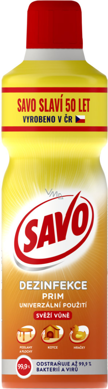 Savo Prim Świeża woń - płynny środek czyszczący i dezynfekujący skutecznie czyści i dezynfekuje oraz nada Twojemu domowi powiew świeżej czystości. Savo Prim to uniwersalny środek czyszczący, odpowiedni także do gospodarstw domowych z zwierzętami domowymi. Niezawodnie likwiduje 99,9 % bakterii, wirów, drożdży i grzybów.