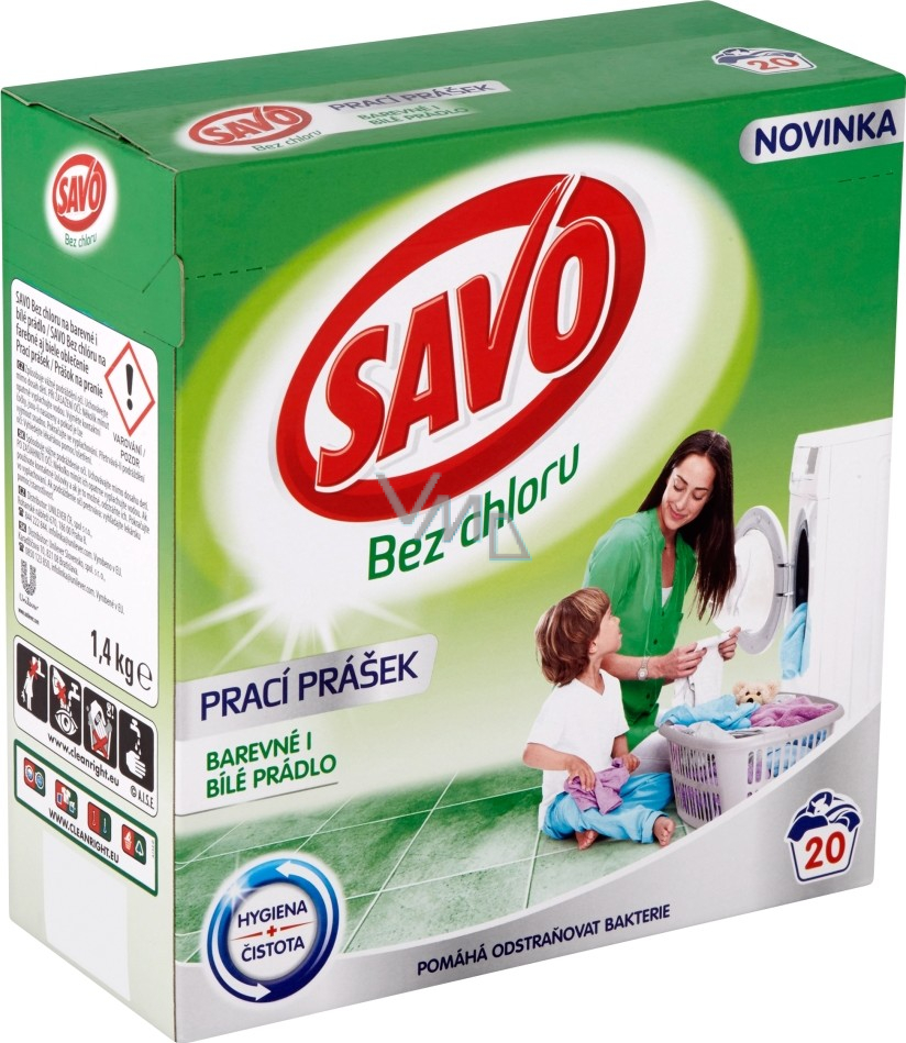 Nové prací prostředky Savo Bez chloru pro hygienicky čisté prádlo. Prací prostředek Savo Bez chloru si poradí i s odolnými skvrnami a navíc pomáhá odstraňovat bakterie.