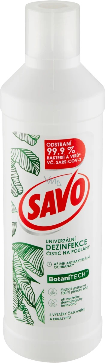 Savo univerzální dezinfekce na podlahy nabízí novou a účinnou řadu dezinfekcí s čisticími látkami na 100% přírodní bázi. Odstraňuje až 99,9 % bakterií a virů, včetně koronaviru SARS-CoV-2 a navíc zaručuje až 24hodinovou ochranu proti bakteriím. Nová řada Savo Botanitech s patentovanou pH neutrální technologií obsahuje oleje z čajovníku a eukalyptu. Řada BotaniTECH obsahuje také vonné látky z citronu, pomeranče, máty, frézie či citronové trávy a spreji tak dodává příjemnou a přirozenou vůni. Výrobek je dermatologicky testovaný a pH neutrální.