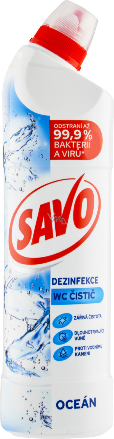 Savo WC żel Ocean to płynny środek czyszczący i dezynfekujący, który oferuje skuteczną formułę dla czystej, zdezynfekowanej i lśniącej toalety bez osadów. Środek usuwa do 99,9% bakterii i wirusów, eliminuje osady i kamień wodny. Przyjemny zapach oceanu zapewni długotrwałą świeżość Twojej toalety.