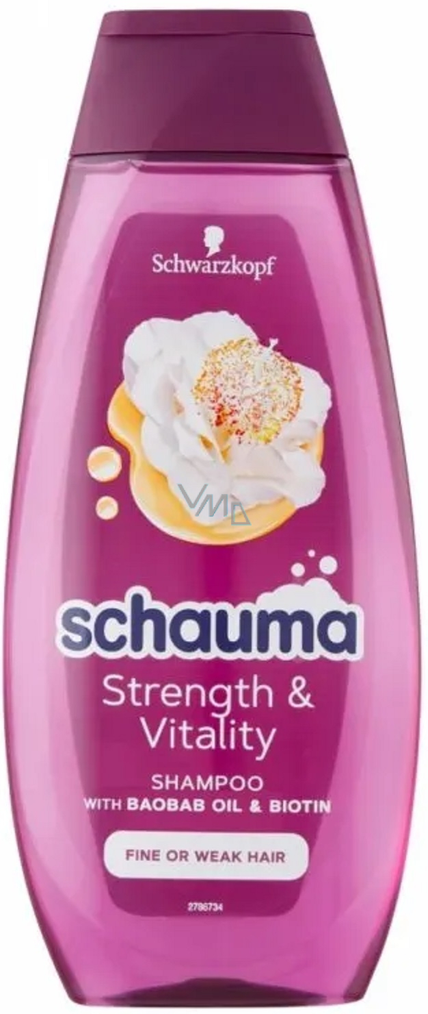 Šampon Schauma Strength & Vitality s mikroživinami a Biotinem pro jemné až slabé vlasy. V kombinaci s balzámem, v porovnání s neošetřenými, poškozenými vlasy až 10x silnější vlasy. Pomáhá chránit vlasy před lámáním. Výběrový 3D komplex ingrediencí navíc podporuje ty nejlepší přirozené vlastnosti Vašich vlasů, posiluje je a poskytuje jim důkladnou regeneraci i péči. Posílení vnitřní struktury vlasů a uhlazení jejich povrchu pro zdravě vypadající hřívu od kořínků až ke konečkům.