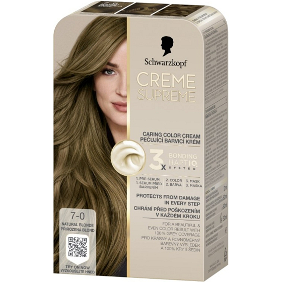 Trwała farba do włosów Schwarzkopf Creme Supreme 7-0 oferuje naturalny, ciepły odcień średniego jasnego blondu. Dzięki innowacyjnej technologii Bonding HaptIQ zapewnia intensywną ochronę i pielęgnację podczas farbowania, co gwarantuje piękny i równomierny efekt kolorystyczny z aż 100% pokryciem siwych włosów.