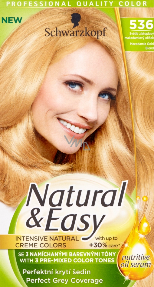 Speciální technologie Color-Mix se třemi namíchanými, jemně sladěnými barevnými tóny poskytuje skutečně přirozený výsledek barvení. V zářivě zlatavých tónech plných barevných odlesků, které nová skořicová kolekce Natural & Easy nabízí, se třpytí světlejší a tmavší pramínky. Vlasy tak vůbec nevypadají jako obarvené. Pečující složení s komplexem ovocných olejů obsahuje i vysoce ceněné ingredience.