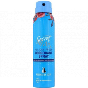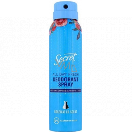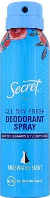 Secret deodorant sprej All Day Fresh Rosewater Scent se snadno nanáší a jeho textura jemně splyne s vaší pokožkou. Deodorant ve spreji vytvoří suchý film, který chrání vaší pokožku před zápachem a zároveň nezanechává bílé a žluté skvrny na vaši pokožce a oblečení. Deodorant sprej All Day Fresh Rosewater Scent od značky Secret vás bude po celý den provázet jemnou a uklidňující vůní.