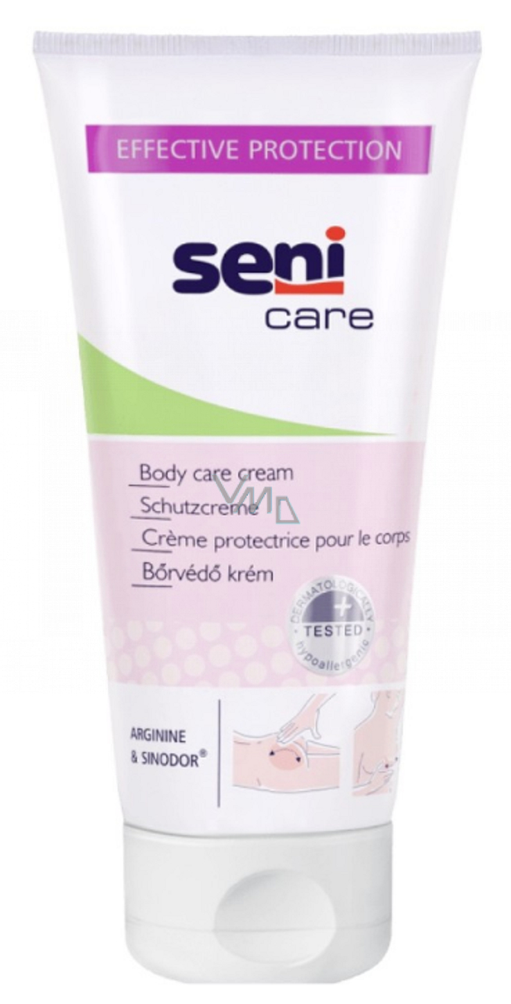 Ochronny krem z argininą Seni Care chroni skórę przed powstawaniem stanów zapalnych, odparzeń i odleżyn oraz jednocześnie ją nawilża. Do pielęgnacji skóry narażonej na podrażnienia, także u osób unieruchomionych na łóżku i używających pieluch. Dzięki aktywnym składnikom chroni przed powstawaniem stanów zapalnych, odparzeń i odleżyn. Ma lekką konsystencję i łatwo się wchłania. Tworzy na skórze przezroczystą warstwę ochronną, która pozwala skórze oddychać. Arginina zawarta w kremie głęboko nawilża i przyspiesza regenerację skóry. Zawiera Sinodor - naturalną substancję neutralizującą zapachy.